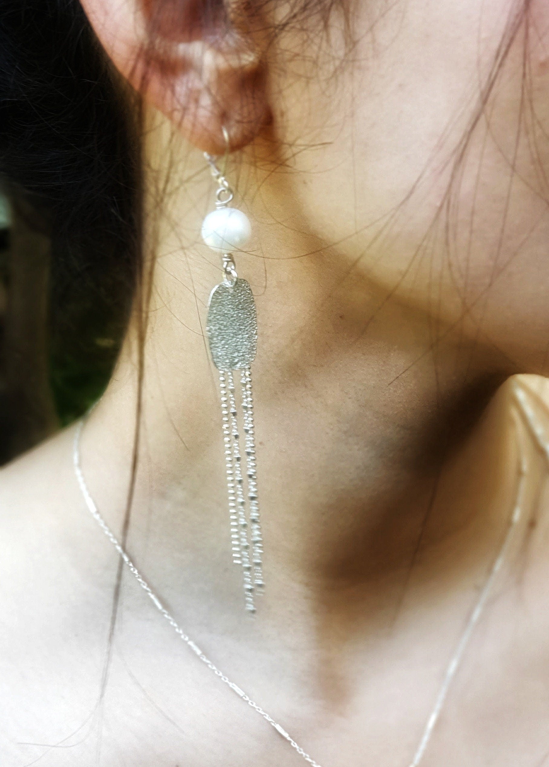 Beautiful elegant and classic earrings for evening, made of sterling silver pendant with a beautiful texture, white pearl and long delicate silver chains.