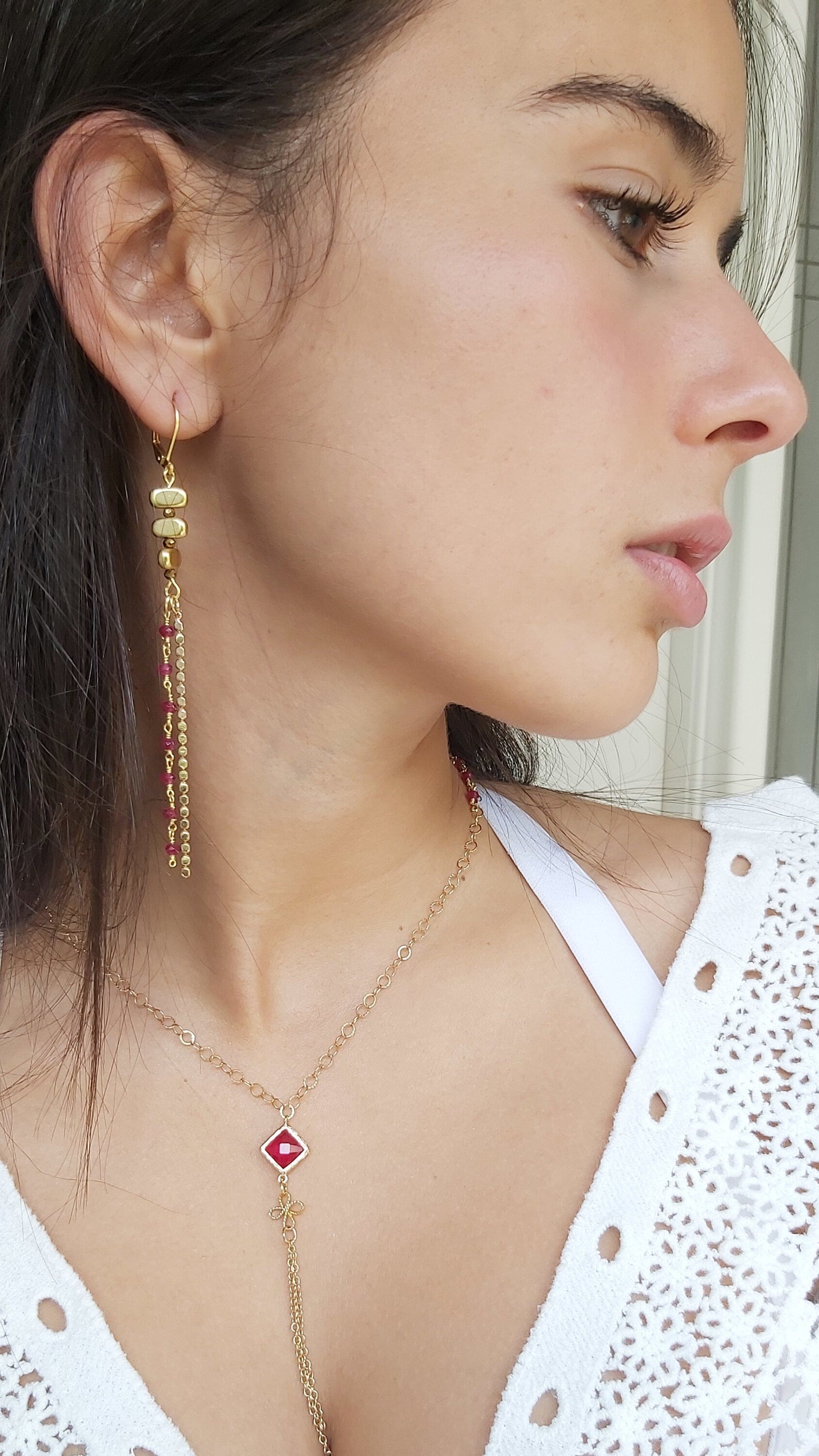 Gold plated sterling silver necklace with small red stone. Delicate and classic necklace.
