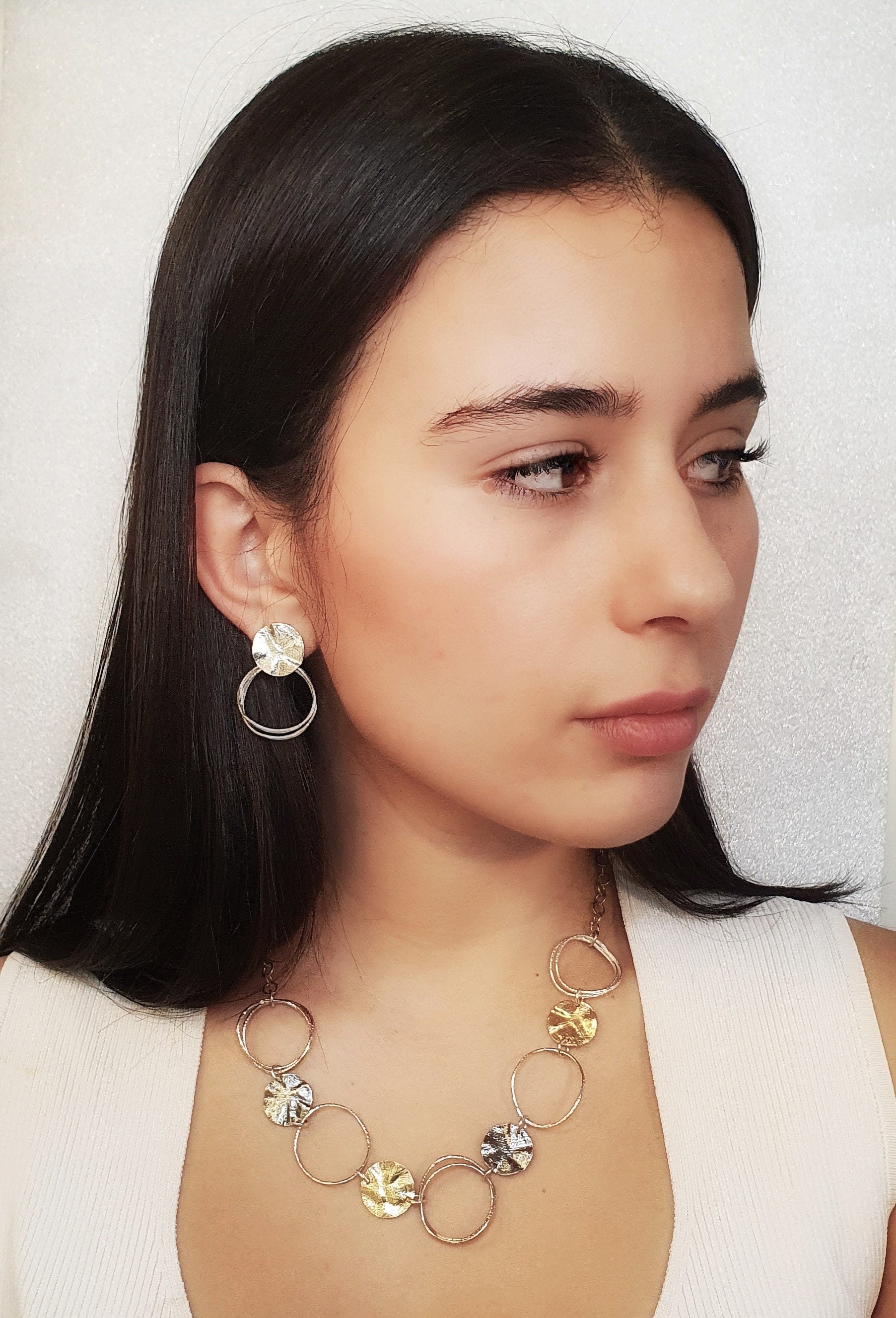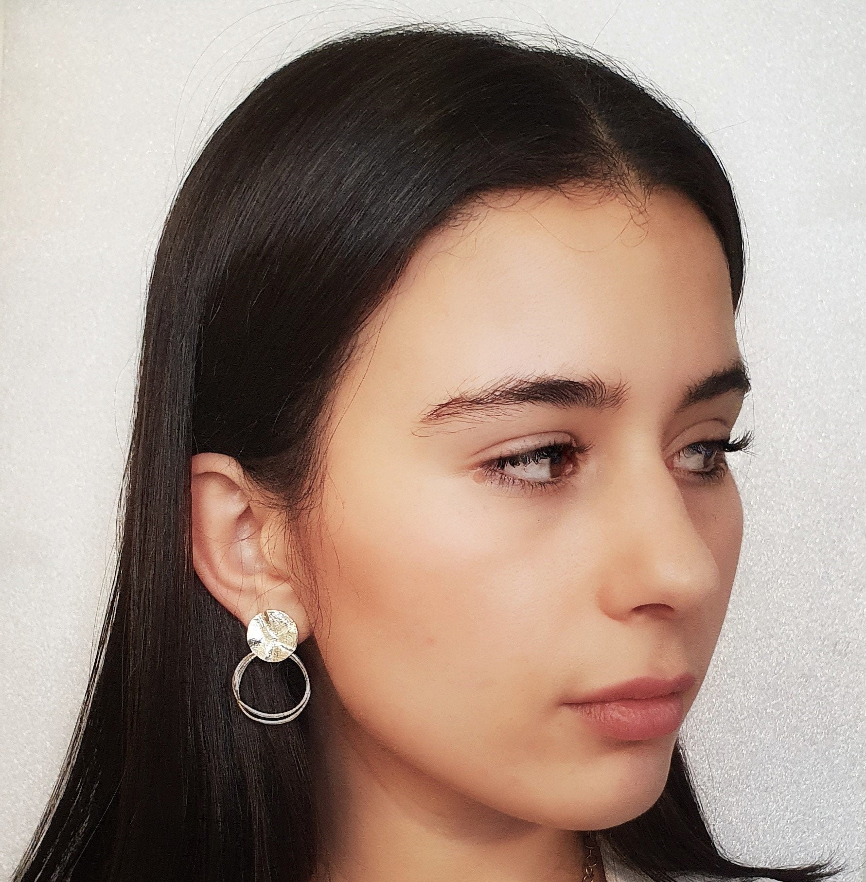 עגילי כסף סטרלינג בעיצוב מינימליסטי המשלב אלמנט בעל טקסטורה ייחודית לצד חישוקים מעוקלים. המבנה האורגני מעניק לעגילים אופי עדכני ועניין עיצובי, תוך שמירה על איזון מינימליסטי. התוצאה היא תכשיט מודרני ואלגנטי בעל נוכחות שיקית וסטייל עדכני.