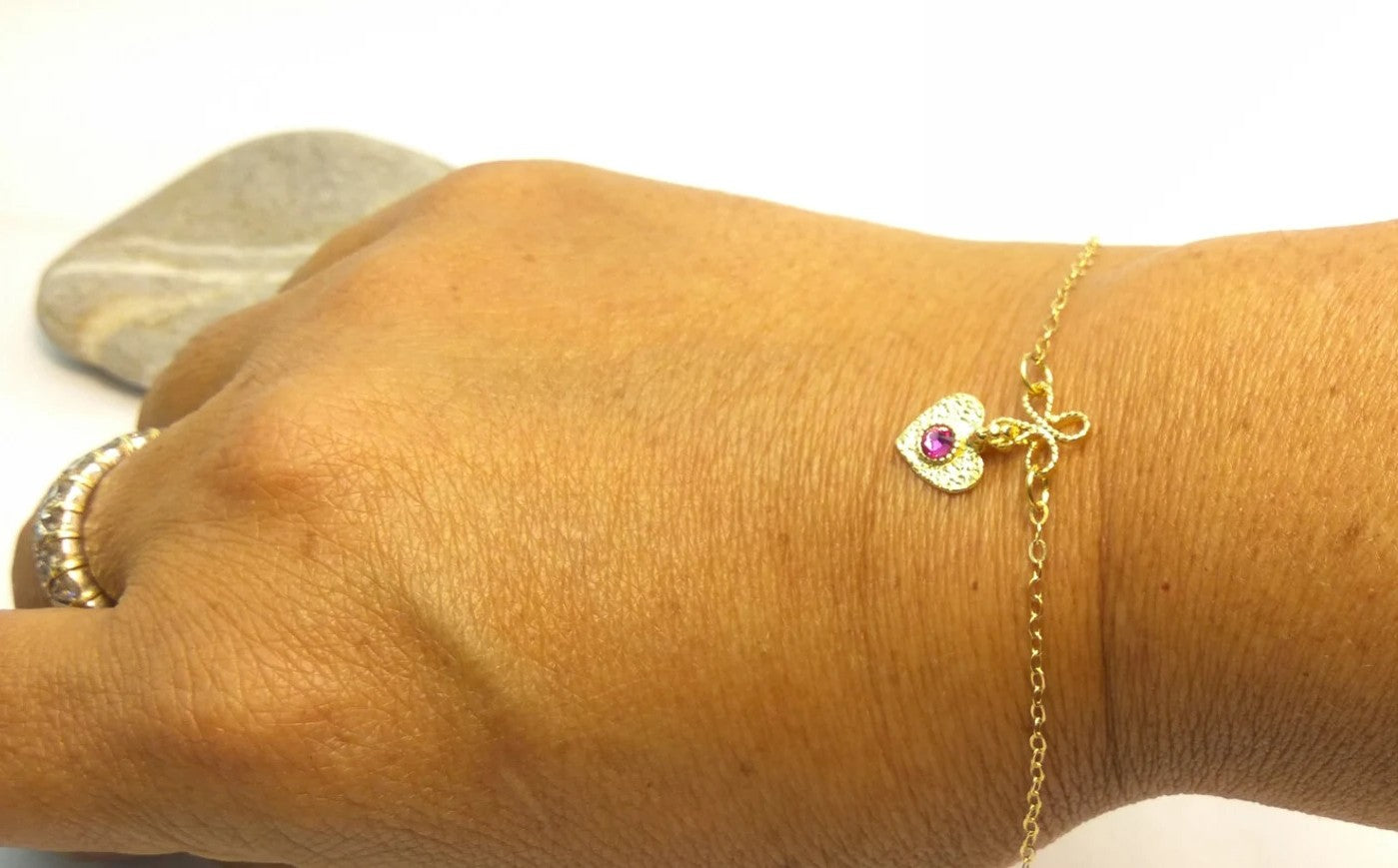 צמיד עדין מכסף סטרלינג מצופה זהב, בשילוב תליון לב קטן משובץ קריסטל בגוון ורוד פוקסיה. תכשיט קליל ומלא חן, המוסיף נגיעה צבעונית מתוקה ושמחה למראה היומיומי, ומתאים במיוחד לילדות, לנערות או כמתנה עדינה בעלת אופי רך ורומנטי.