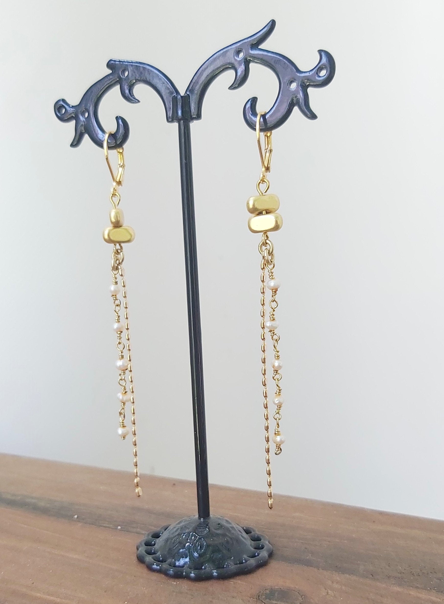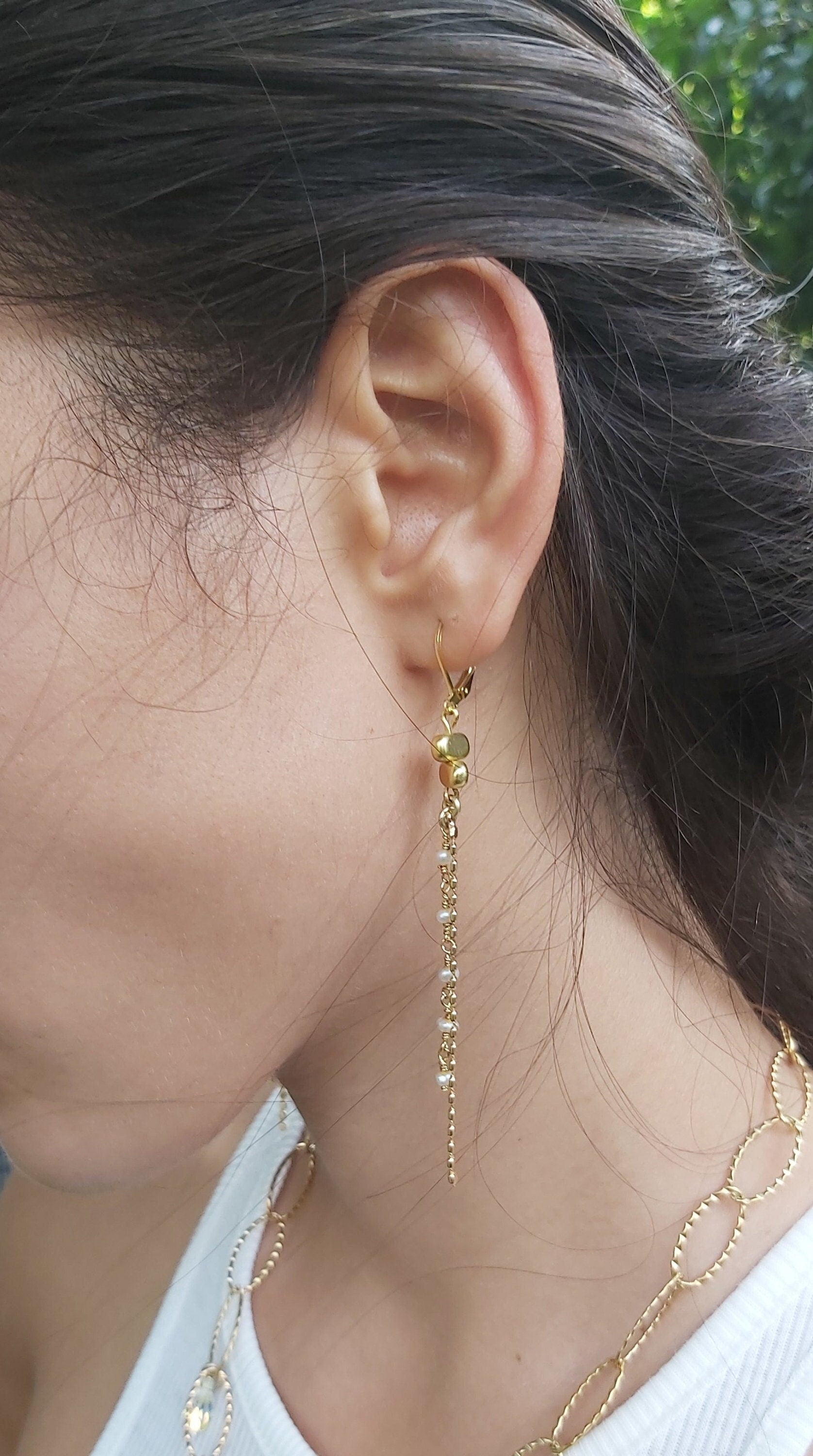 עגילי כסף בציפוי זהב בעיצוב ארוך ומרשים, המשלב פנינים עם אבני המטיט למראה רומנטי ואלגנטי. השרשראות המשתלשלות מוסיפות תנועה עדינה, והשילוב בין החומרים יוצר מראה רומנטי ועדין. תכשיט שמביא נוכחות שיקית ותחושה צעירה.